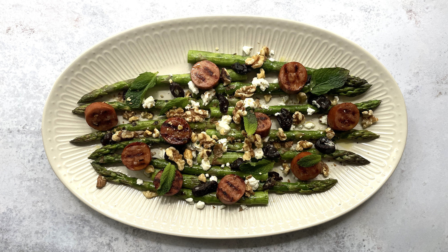 • To assemble the salad, start by laying the asparagus onto a serving dish then top with the kabana followed by sprinkles of goat cheese, crushed walnuts, and dates. Drizzle with the dressing and garnish with mint leaves prior to serving.