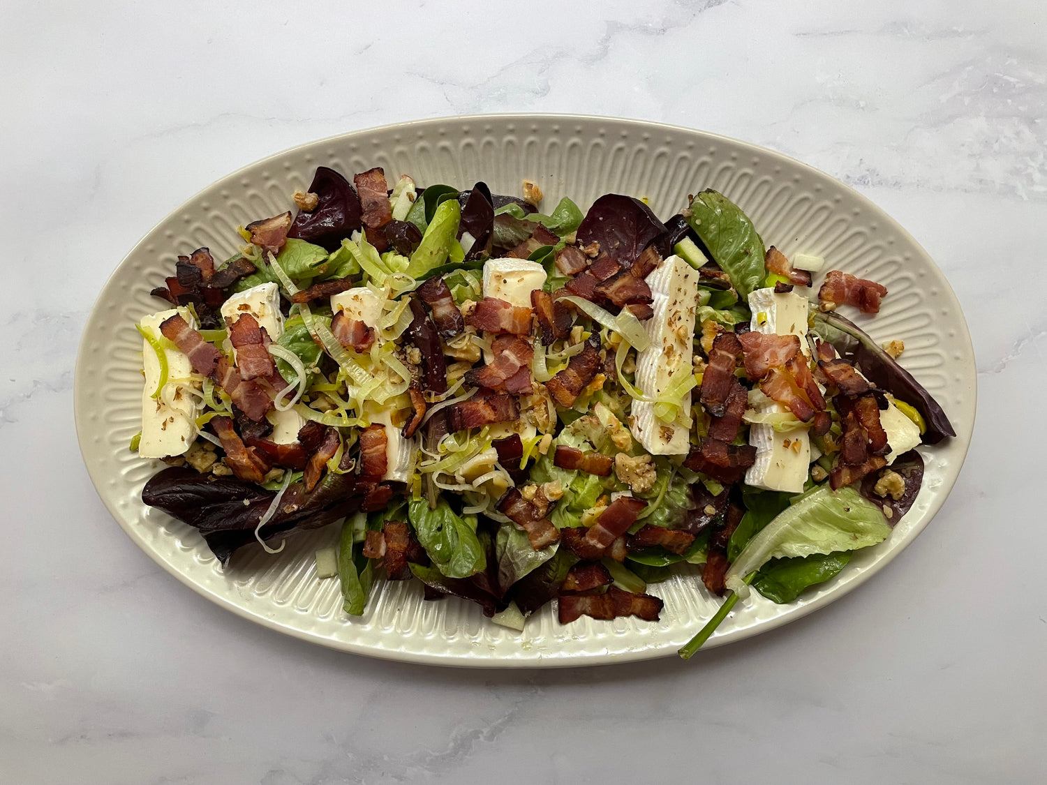 • Place the strips of camembert evenly across the salad and gently scatter the remainder of the other ingredients on top of the salad.