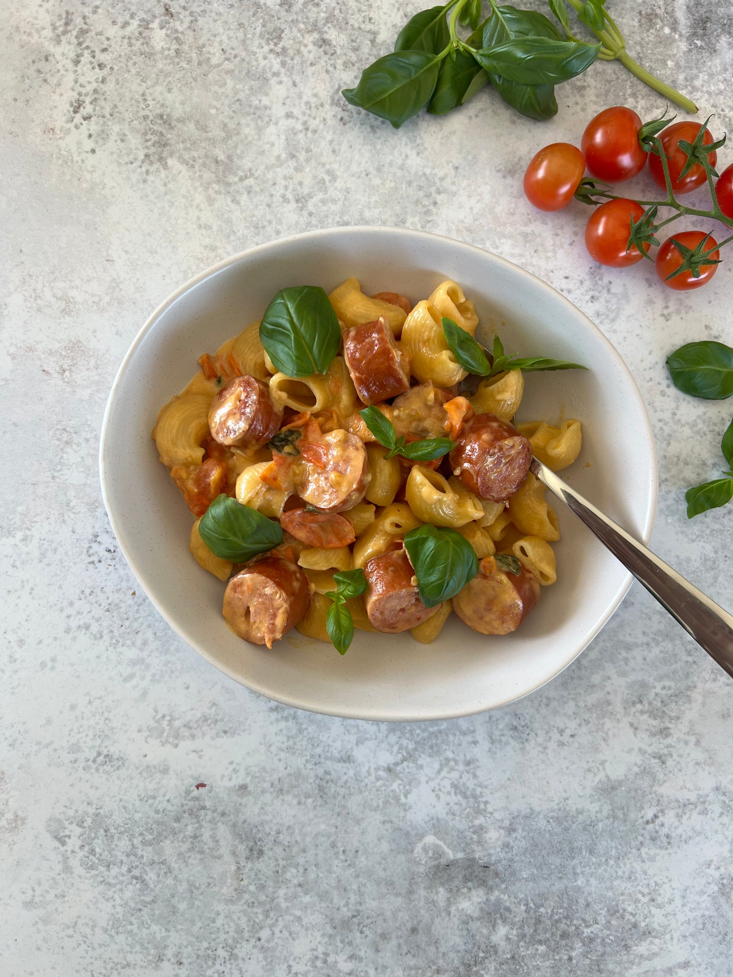 A bowl the whole family will love — creamy tomato pasta loaded with cheese and smoky pieces of Gotzinger’s The Big Cheese Kransky. Quick to make, gone in minutes!