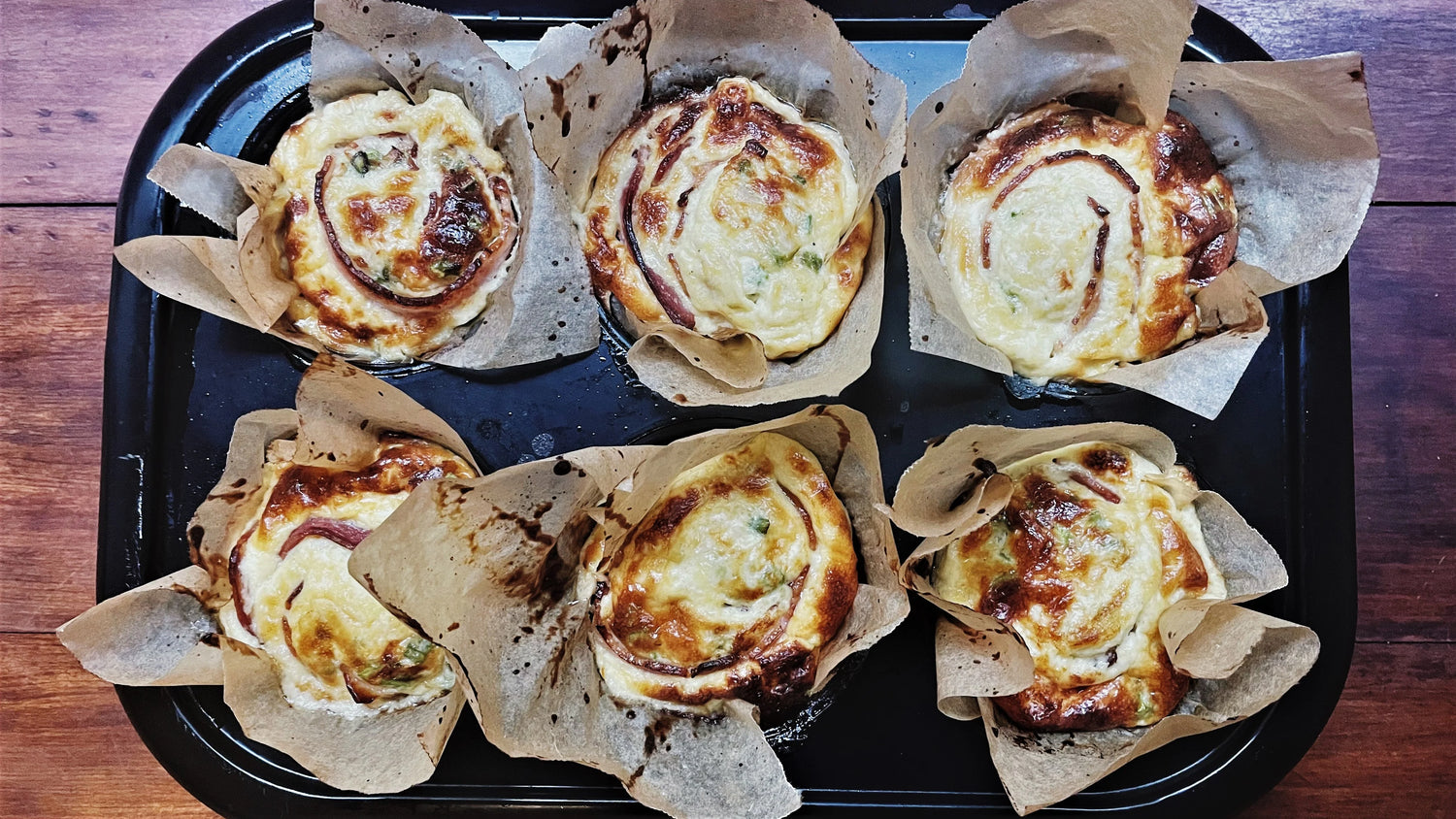 • Lay two pieces of bacon on top of each other and loosely create a coil and place into each cup in the tray then fill with quiche mixture – repeat until all 6 are filled.
