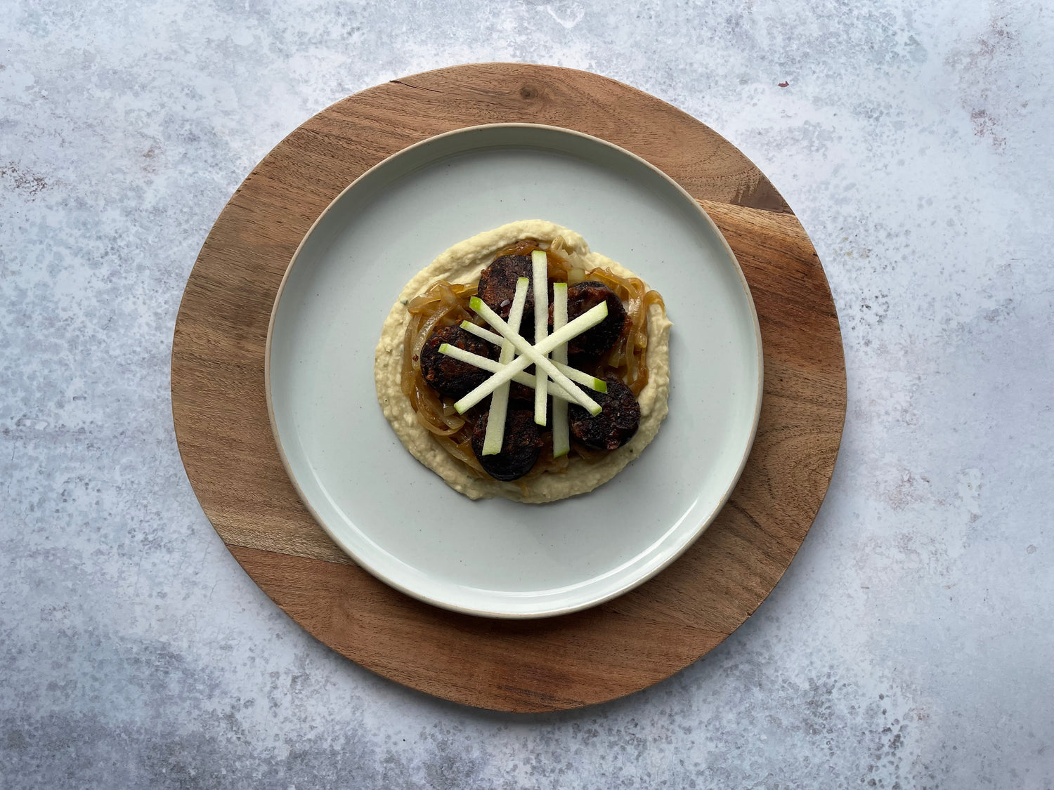 Impress your guests this weekend with this easy-to-make entrée dish. Featuring grilled slices of Götzinger’s Black Pudding on a bed of butter bean puree and apple cider braised onions.
